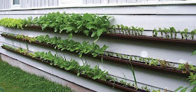 Para montar a estrutura que suportará a sua horta você pode usar calhas plásticas coletoras de chuva como vazo de terra, adapte as calhas na parede de forma que fiquem fixas e firmes na parede, mais ou menos desse jeito: